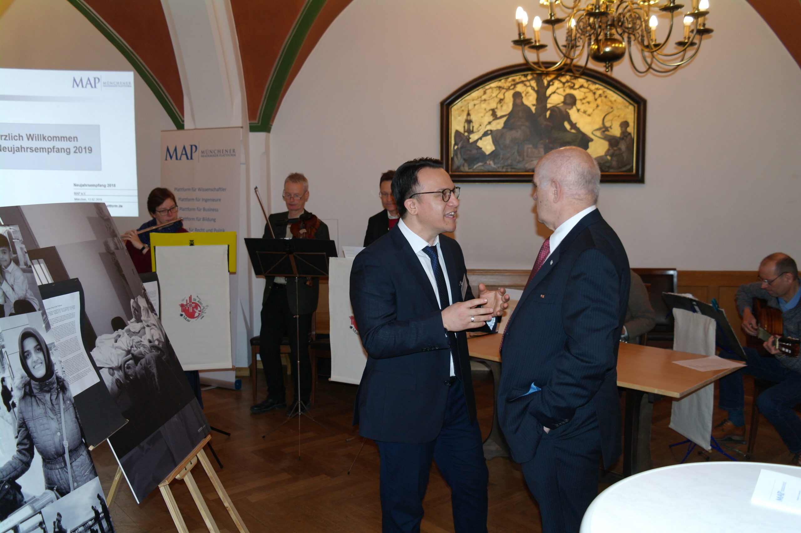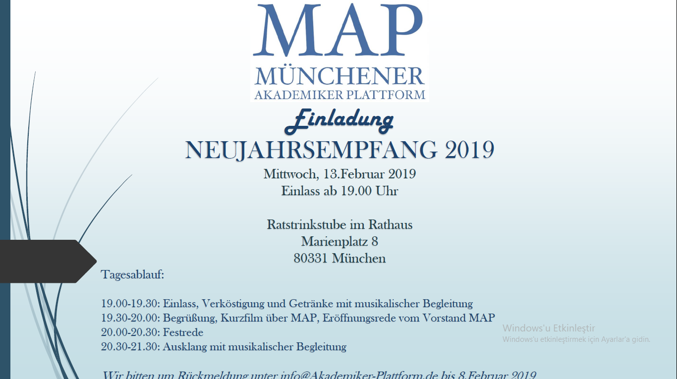 Die Münchener Akademiker Plattform wächst weiter. Am 13.2 haben wir im neuen Rathaus unseren 5. Neujahrsempfang gefeiert. Der Vizepräsident des Bayerischen Landtags Markus Rinderspacher, Ingrid Ritt von der Stiftung Wertebündnis, Stadträtin Heike Kainz und Johann Wagner vom Bezirksausschuss Allach-Untermenzing nahmen u.a. an der Veranstaltung teil. Durch den Abend führte Moderator Xavier Rosell. Zunächst zeigte ein Kurzfilm einige Aktivitäten des Vereins. Anschließend wurden in der Begrüßungsrede durch den Vereinsvorstand aktuelle Aktivitäten des Vereins im beruflichen sowie im kulturellen Bereich erwähnt. Im Folgenden wurde in der Rede ein großer Wert auf Demokratie, Menschenrechts- und Integrationsprobleme gelegt. Dabei wurde insbesondere auf Menschenrechtsverletzungen in der Türkei eingegangen. „Wir müssen uns gemeinsam für mehr Demokratie und Recht einsetzen”, hieß es in der Rede. Frau Ritt forderte in ihrer Rede Einheit und Bündnis. Zum Abschluss des Abends genossen die Gäste ein offenes Buffet mit Gerichten aus der orientalischen Küche, begleitet von Bayerischer Volksmusik gespielt von der Gruppe St. Alto Musik.